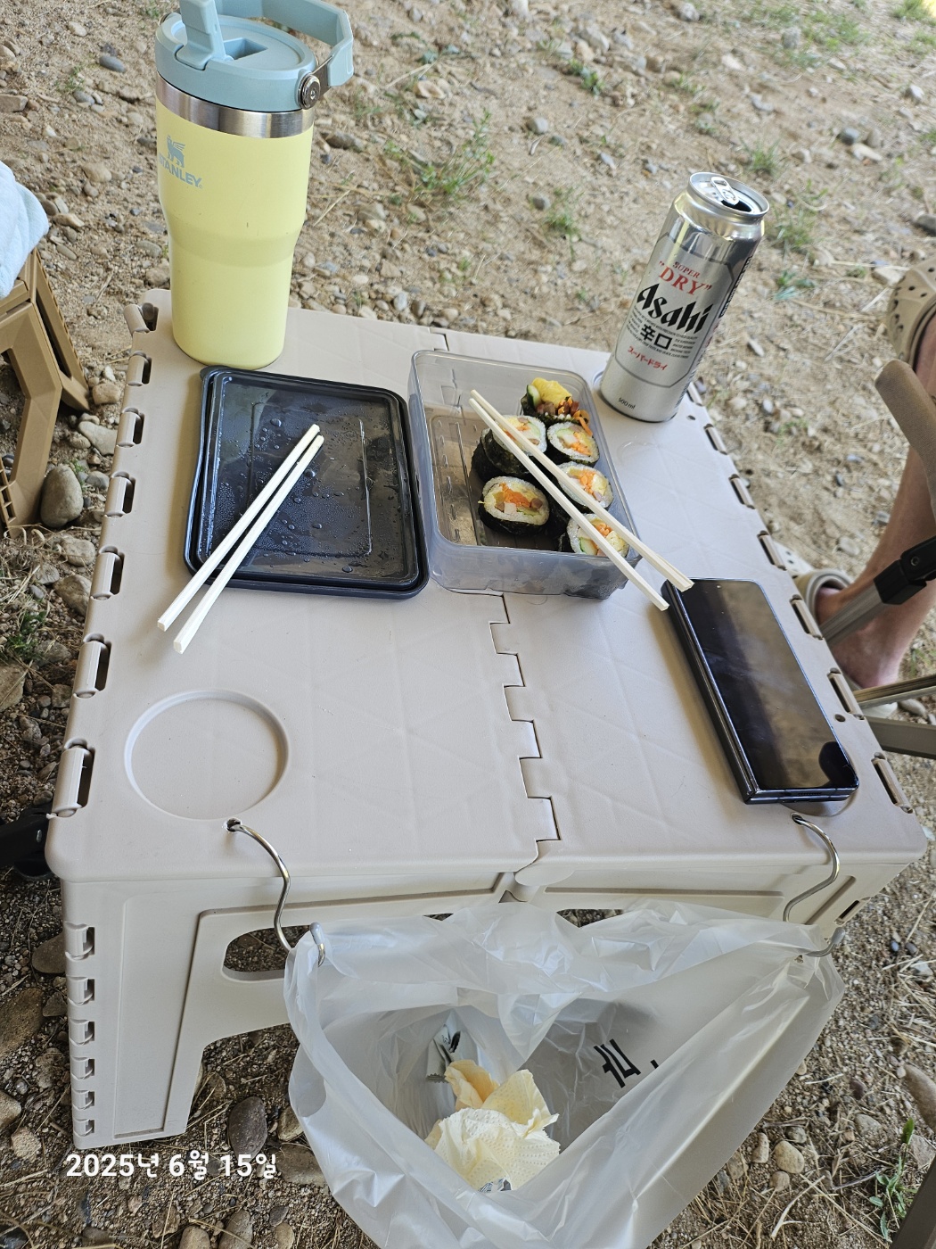 다리밑 그늘 자리 평평한 곳에 자리 잡아 간단하게 김밥과 과일을 먹고 잠깐 쉬었다.